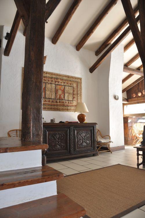 The apartment has 112 m2 of living space and includes a large room with an open kitchen and a very comfortable living space with a large fireplace. The living area is south facing with large sliding doors opening to a garden with a beautiful view. The interior is contemporary, the wood beams on the ceiling reveals the old farmhouse and looks great with the white tiles on the floor.