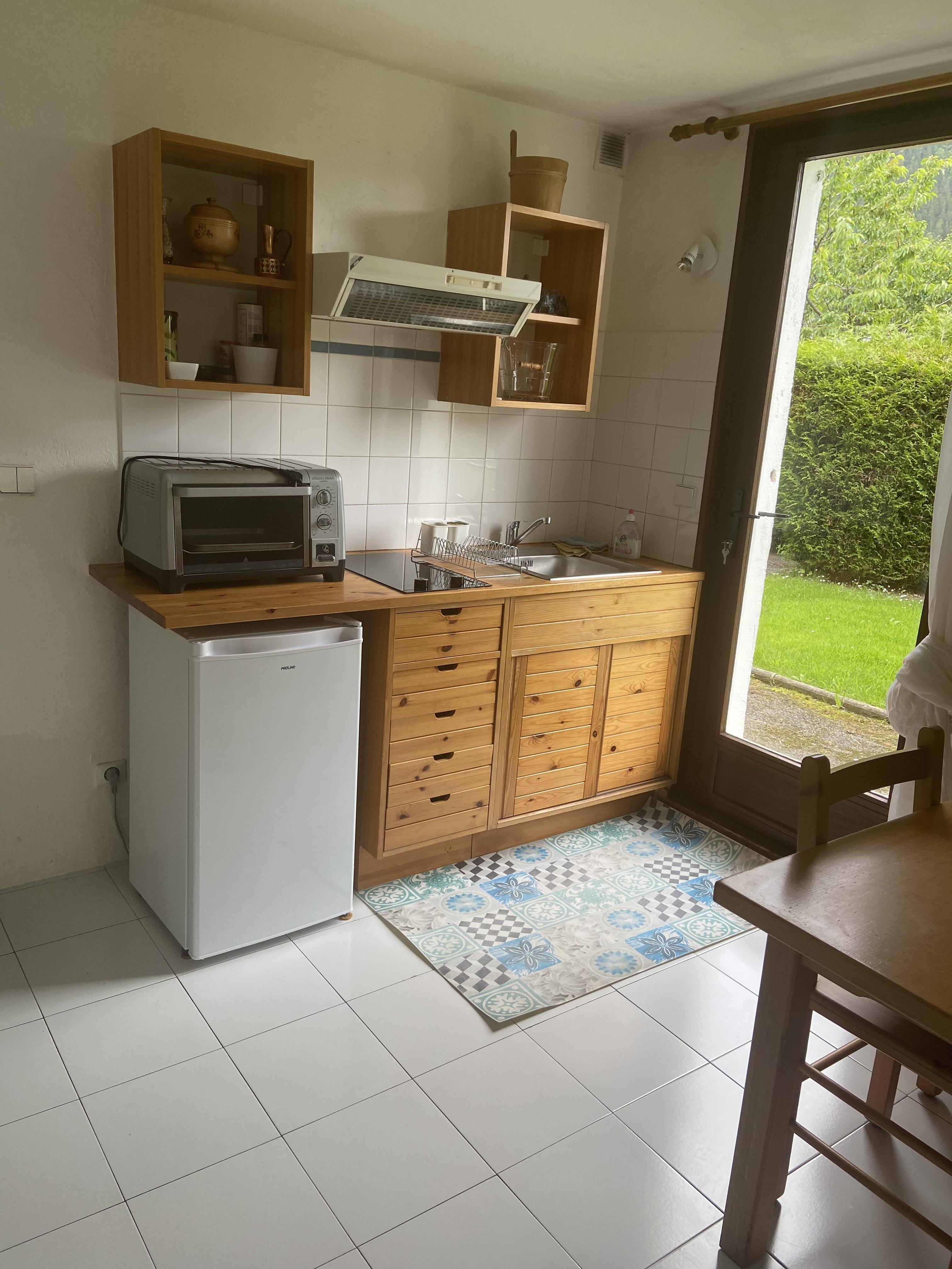 - kitchenette ouverte sur le séjour avec mini-four, frigo, 2 plaques électriques