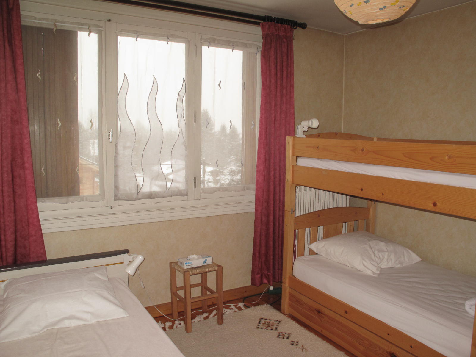 2e chambre : un lit superposé avec deux couchages de 90, un lit de 90, placard et penderie.
